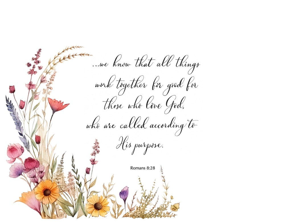 "All things work together for good" Romans 8:28 in hand calligraphy. Printed on #110 white heavy card stock with quality envelopes. Note Cards are packaged in sets of 10 in a resealable clear sleeve. The cards are folded with blank inside for your personal message. 4.25" x 5.5" in size.
